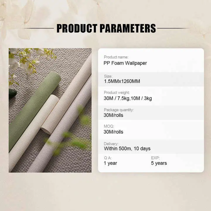 · پائیدار اور پانی سے بچنے والا مواد: ہمارا پی پی فوم وال پیپر اعلی معیار کے پولی پروپلین مادے سے بنایا گیا ہے ، اس بات کو یقینی بناتا ہے کہ یہ نمی کا ثبوت ، واٹر پروف اور سڑنا اور گرمی کے لئے مزاحم ہے ، جس سے یہ گھریلو ، تجارت اور انتظامیہ کی جگہوں سمیت مختلف ماحول میں استعمال کے ل perfect بہترین ہے۔